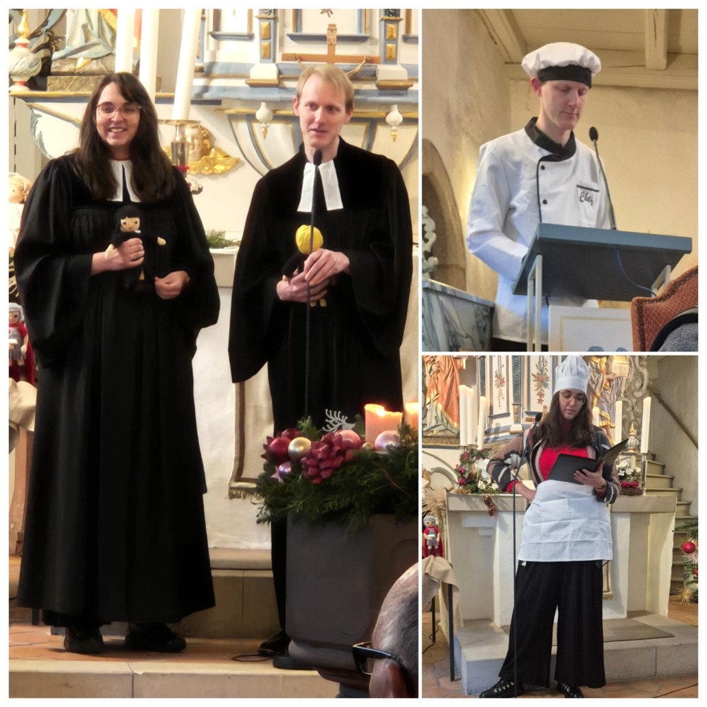Nach fast 5 Jahren wurde unser Pfarrersehepaar Nicola und Konrad Aller am 2. Weihnachtsfeiertag während des Gottesdienstes „Fränkische Weihnacht“ verabschiedet. Neben den Liedern, die in fränkisch von der Gemeinde gesungen oder von der Band Hope & Mind gespielt wurden, war auch die Predigt, mit der sich Konrad und Nicola Aller von der Gemeinde verabschiedeten, in Mundart gehalten.