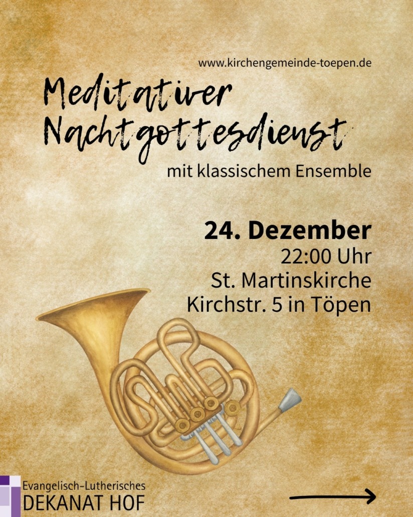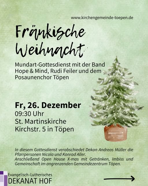 | 24.12.2025 – Heilig Abend 14.30 Uhr – Isaar | 25.12.2025 – 1. Weihnachtsfeiertag 8.30 Uhr – Isaar | 26.12.2025 – 2. Weihnachtsfeiertag 9.30 Uhr – Töpen |